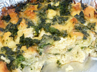 Butter the inside of your 3 qt baking dish. Layer the bottom with 1/3 of bread cubes. Top with 1/3 of spinach mix, then 1/3 of each of the cheeses. Repeat until done. In medium bowl, whisk eggs, milk, and remaining 1/2 tsp of salt and 1/4 tsp of pepper until blended. Pour evenly over the bread mix.